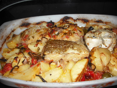 Descascar e cortar às rodelas finas, metade da cebola, dos tomates, picar os alhos, e acrescentar os restantes ingredientes. Colocar o bacalhau por cima, as batatas à volta e nos intervalos. Espalhar por cima a outra metade dos ingredientes. Regar abundantemente com o zeite e levar ao forno até obter uma cor dourada.