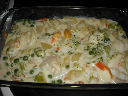 Cozer os legumes, os ovos e os lombos de pescada e as batatas. Prepare o molho bechamel. Deite num tabuleiro de ir ao forno todos os ingredientes cozidos, envolva com o bechamel e leve ao forno cerca de 10 minutos.