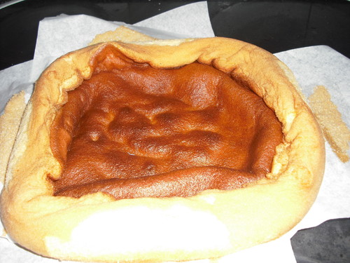 Bater as gemas, os ovos, o açucar e a raspa da laranja aé obter um creme fofo. Depois, com uma colher de pau, mexer a mistura de baixo para cima, devagar, enquanto se espalha a farinha, deixando-a cair em chuva por entre os dedos. Depois de bem ligada, despejar o preparado na forma de aro, forrada com papel vegetal e untada durante 20 minutos em forno quente (um pouco mais forte que médio). Retirar e deixar arrefecer. O tecto do bolo vai abaixo até cerca de metade da altura, o que é normal, pois deve ficar mal cozido para que fique no meio o doce de ovos.