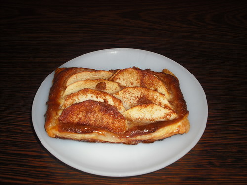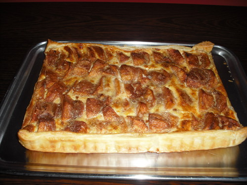 Colocar a massa folhada dentro da forma, picar com um garfo para a massa não crecer. Cortar as maçãs em quartos e colocá-los sobre a massa bem juntinhos. Juntar a canela e o açucar e espalhar por cima das maçãs. Bater os ovos com as natas e pôr por cima das maçãs já polvilhadas com o açucar. Levar ao forno a 180ª cerca de 40 minutos.