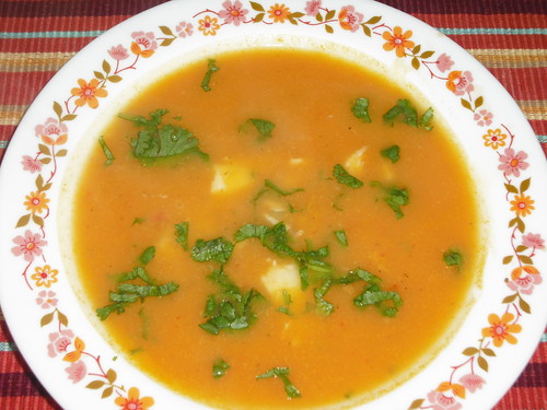 Colocar a cebola às rodelas, os tomates, os alhos o piri piri, os pimentos e por cima o peixe, quando ferver regar com o vinho branco. Deixar estufar até o peixe com os camarões e as ameijoas estarem cozido. Entretanto fazer uma base com as cenouras e as batatas. Retirar o peixe e o marisco. Juntar a base da sopa com o molho da cebola, tomate e os restantes ingredientes (retirar o piri piri) e passar tudo com a varinha mágica. Juntar o peixe desfiado e salpicar com muitos coentros picados. É das melhores sopas de peixe que já comi