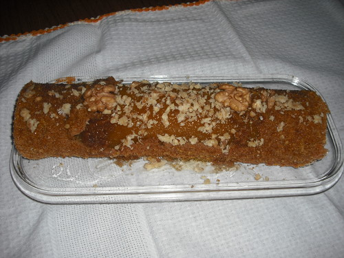 Colocam-se todos os ingredientes numa taça e mexe-se com a mão até estar tudo ligado. Forra-se o tabuleiro com papel vegetal e vai ao forno pré-aquecido a 180º, até a parte de cima estar cozida. Não convém cozer demasiado. No meu caso deveria ter ficado mais um pouco. Depois de cozida, e ainda quente coloca-se em cima de um pano polvilhado com açucar e enrola-se. Eu decorei com nozes partidas para disfarçar a "pelada".