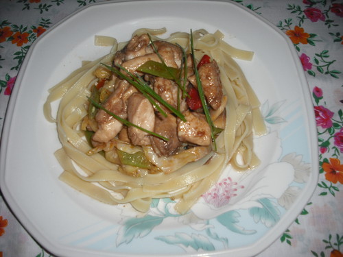 Comecei por temperar o frango partido aos cubos pequenos com os alhos esborrachados, o wisque e sal, deixei marinar cerca de 1 hora. No wok coloquei um pouco de azeite, e os legumes cortados em pequenos pedaços, deixei saltear cerca de 10 minutos, temperei com um pouco de sal e pimenta. Entretanto numa frigideira com um pouco de azeite cozinhei o frango, acrescentando no fim o resto da marinada e um pouco de molho de soja. Por fim cozi a massa em água e sal.