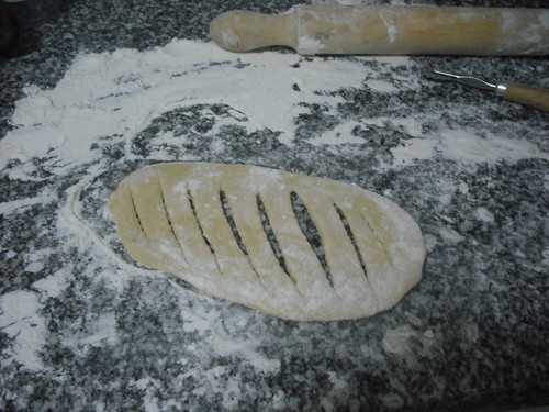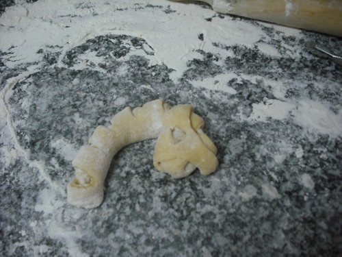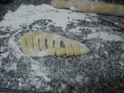 Após esse tempo, dividir a massa em bocados de aproximadamente 50 gr (eu fiz a olho), estender cada bocado de forma oval, dar uns golpes de viés na massa sem chegar ás pontas e enrolar em caracól conforme as fotos.
