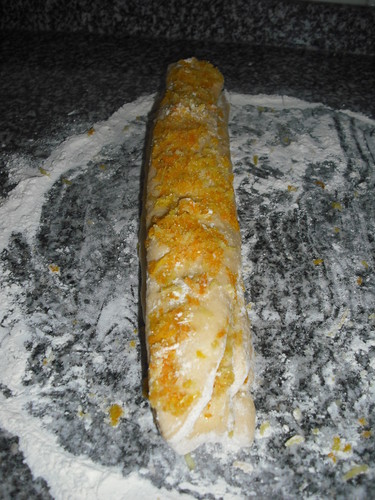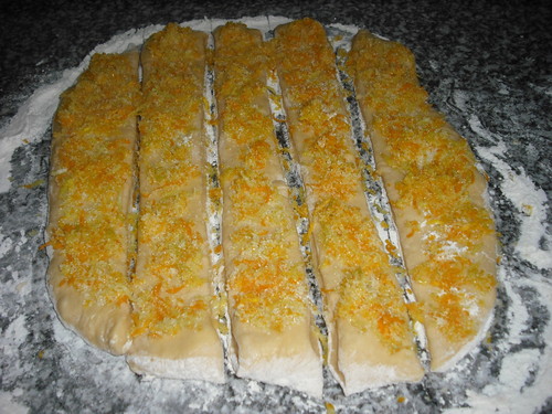 Pincelar com a margarina derretida. Cortar em 5 tiras de 10x30cm. Barrar cada tira com a mistura de raspas de laranja/limão/açucar. Sobrepor as tiras.