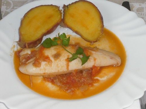 cortei os tentáculos e as abas laterais, um bocadinho de chouriço patido muito miudinho, cebola e alho pidadinhos, 2 tomates pequenos, um pouco de azeite e refoguei tudo, quando já estava meio cozido juntei um ovo cozido partido aos bocadinhos. Depois com este preparado recheei as lulas. Fiz ourto refogado com bastante cebola, tomate e 1 dente de alho. Coloquei as lulas e deixei cozer, se estiver muito seco juntar um pouco de vinho branco. Acompanhei com batata doce e estava uma delícia!