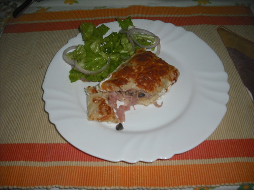Cortei os cogumelos em laminas, o alho francês às rodelas finas, coloquei tudo no wok com um pouco de óleo de girassol, levei ao lume até começar a reduzir o volume. Fiz um molho bechamel um pouco espeço (aproveitei o líquido dos legumes e leite). Envolvi tudo, deixei arrefecer. Forrei uma forma com o rectangulo da massa folhada (do Lidl). Uni as pontas da massa para ficar tudo coberto, dei uns cortes e levei ao forno até ficar com uma cor dourada.