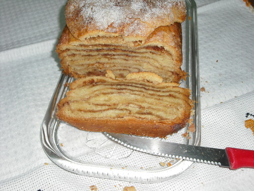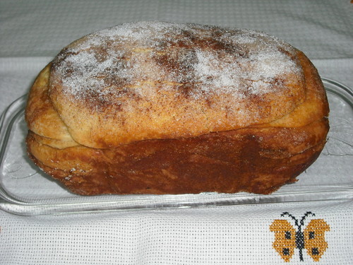 Colocar os todos os ingredientes pela ordem descrita no ponto 1, na cuba da máquina de fazer pão. Selecionar o programa "MASSA". Quando a máquina terminar de amassar retirar e dividir a massa em 10 partes. Estende-se cada parte, formando um rectângulo, ligeiramente mais pequeno do que a cuba da máquina, pincela-se com a margarina derretida dos dois lados e polvilha-se generosamente com a mistura de açucar e canela. Retiram-se as pás da máquina e coloca-se no fundo, faz-se o mesmo com os restantes bocados de massa, polvilhando bem cada camada com açucar e canela, pois a receita base não leva açucar. Deixar levedar dentro da máquina, (eu deixei levedar com a máquina desligada). Após esse tempo voltei a ligar a máquina no programa "COZER" e pronto!!