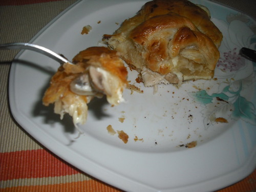 Começar por saltear os cogumelos com um fio de azeite, sal e pimenta e deixar arrefecer. Grelhar ligeiramente os bifes dos 2 lados apenas com sal. Dividir cada rolo de massa em 2, em cada metade colocar 2 fatias de queijo lado a lado, por cima 1 bife de frango, por cima uma boa camada de cogumelos e para terminar mais 2 fatias de queijo. Apanhar as pontas da massa com jeito para não romper e fazer género de trouxa apertando as pontas para fechar. Pincelar com gema de ovo misturada com 1 colher de sopa de leite. Levar ao forno até ter a côr desejada. Acompanhar com 1 boa salada.