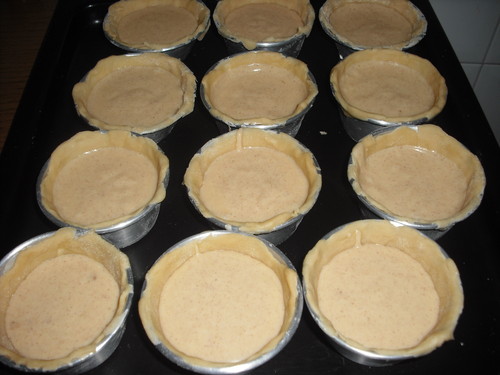 Faz-se uma massa com a farinha, 25 gr de açucar, a margarina cortada aos bocadinhos e à temperatura ambiente, o ovo e a água. Trabalha-se tudo junto com as pontas dos dedos até estar tudo ligado. Faça uma bola e deixe descansar no frigorífico cerca de 2 horas.