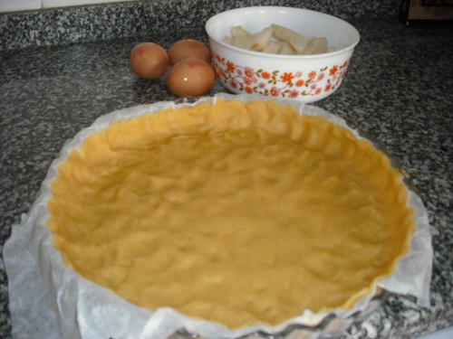 Polvilhe a pedra da bancada com farinha e estenda a massa com o rolo (eu prefiro pôr a massa directamente na forma e ir esticando com os dedos do centro para os bordos). Forre a tarteira com a massa.